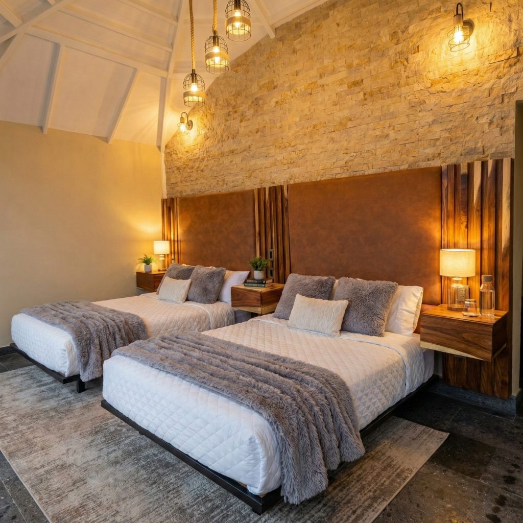 Tu cabaña te recibe con calidez: madera, texturas, luz suave.